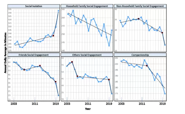 - Le temps passé seul n’a augmenté que de 24 minutes par jour en 17 ans un effet qui ne justifie peut-être pas le terme « épidémie ».